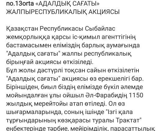 "Адалдық сағаты" жалпы республикалық акциясы » № 13 орта мектеп жанындағы интернатымен