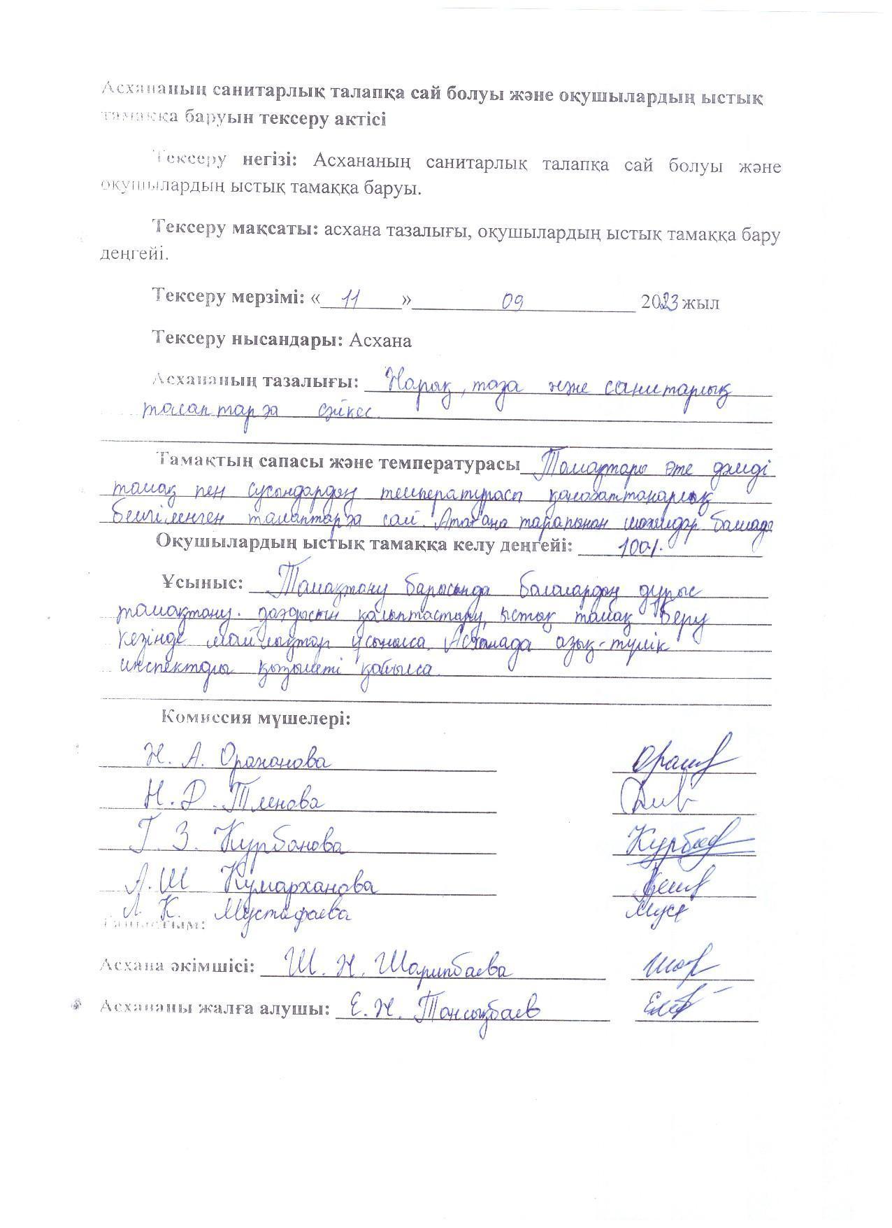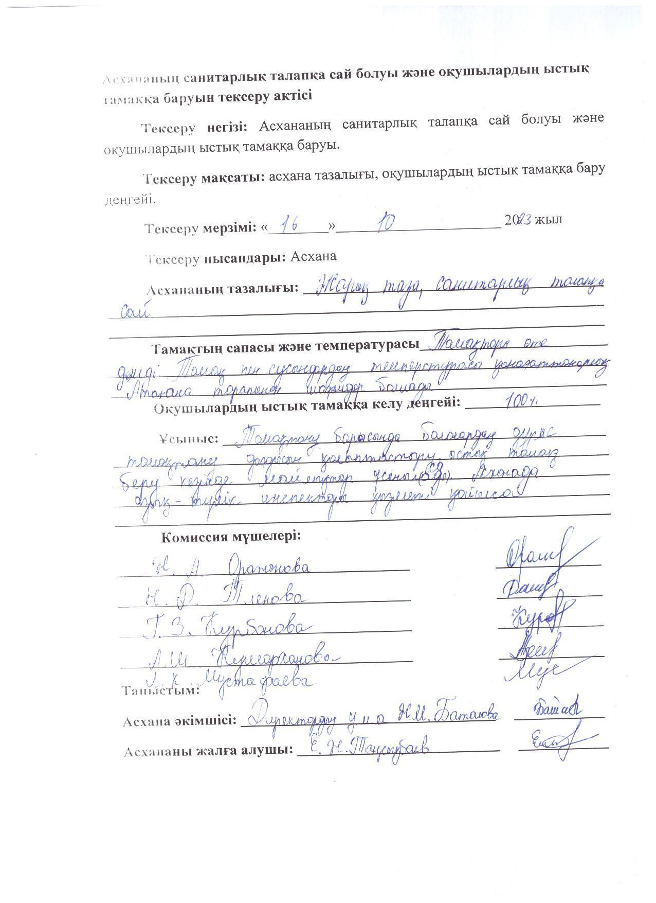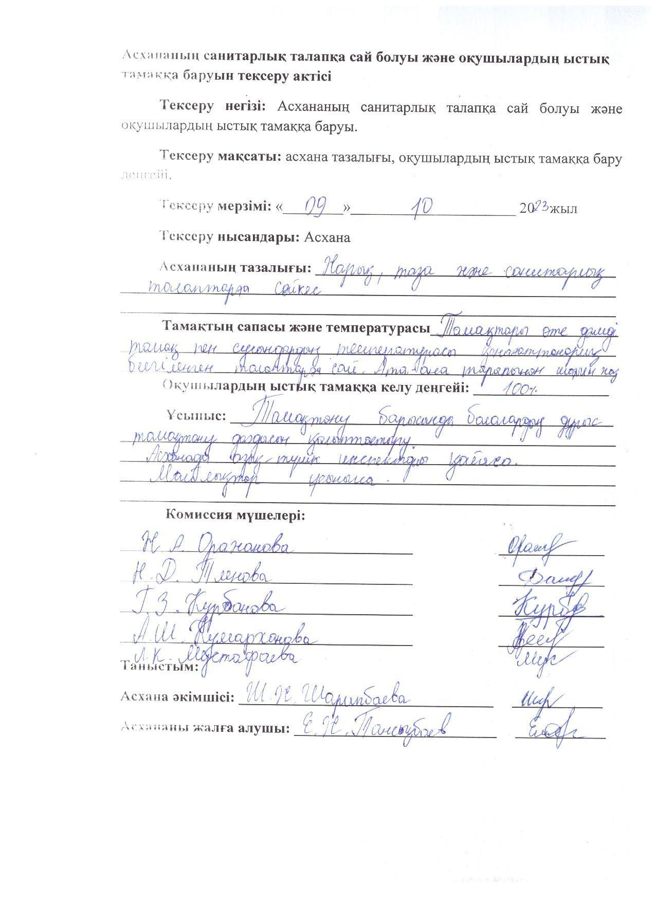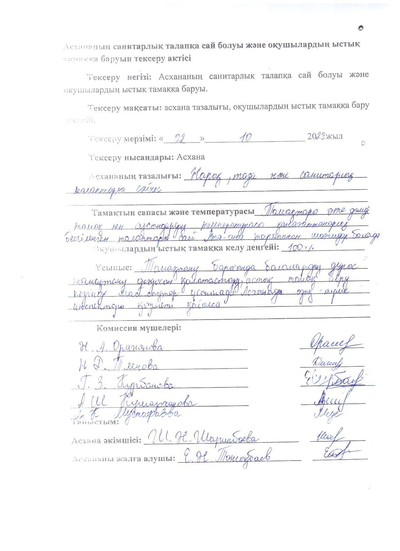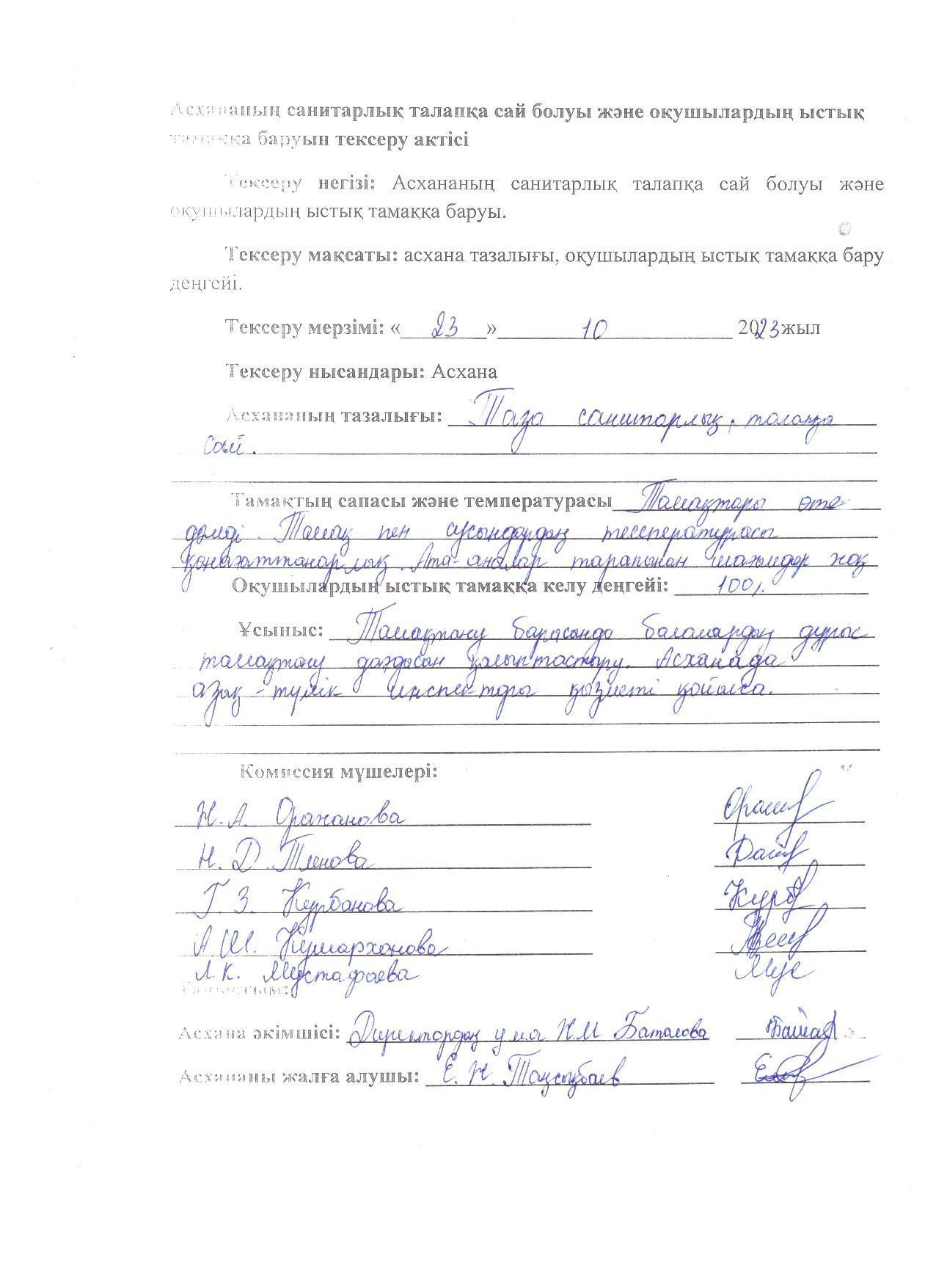 24 октябрь 2023 0 1 2 3 4 5 2023-2024 оқу жылындағы Жалпыға бірдей міндетті оқу қорынан тегін ыстық тамақ бойынша Асханадағы тағам сапасын тексеру АКТсі